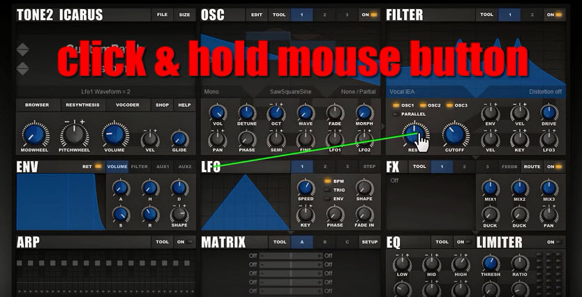 – Release the mouse button and the ENV or LFO will be assigned to that knob (or release over an empty part of the GUI to abort).
